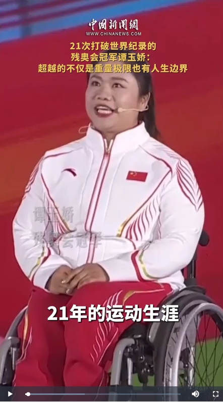 1990年出生的譚玉嬌7歲時(shí)因骨髓炎導(dǎo)致右腿殘疾。如今,她拿到了43枚金牌,21次打破世界紀(jì)錄。一次次超越重量極限的她,也在超越著她人生的邊界。譚玉嬌成為中國首位國際殘奧委會運(yùn)動(dòng)員委員會委員,在巴黎殘奧會閉幕式上留下了屬于中國的獨(dú)特印跡。