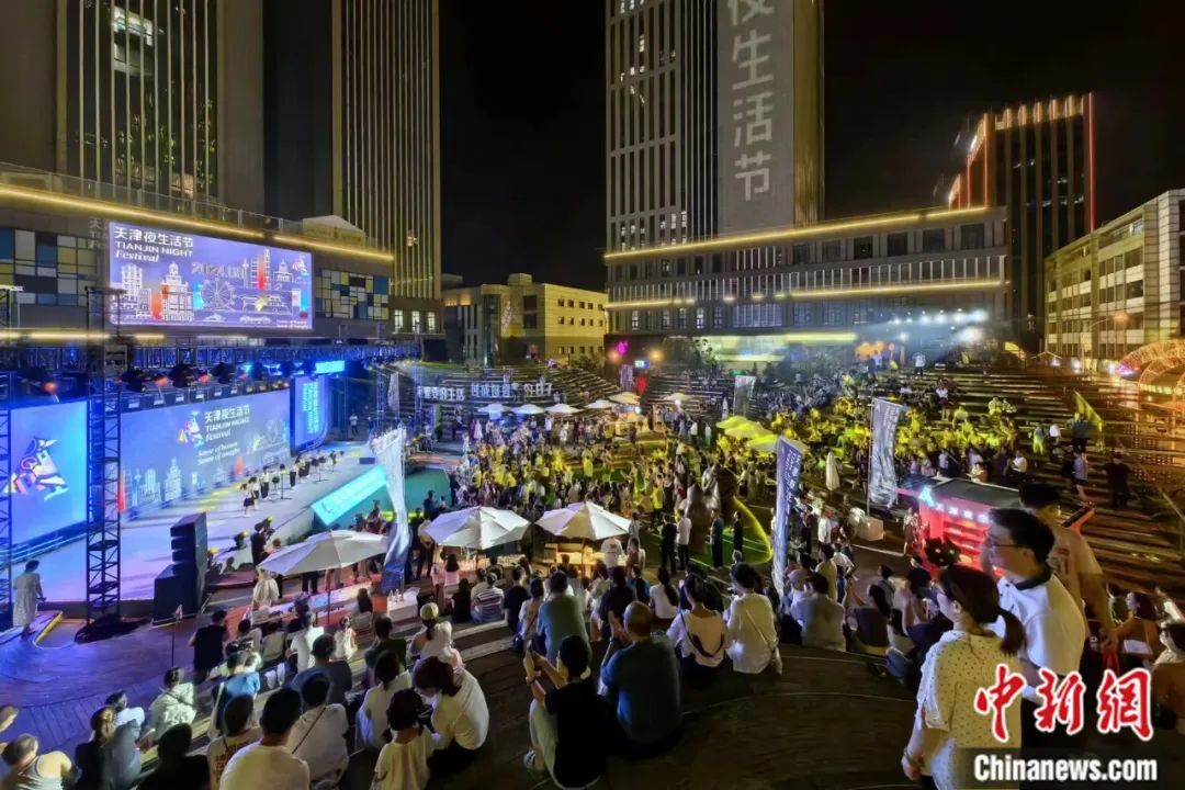 8月2日晚,由天津市商務(wù)局、天津市文化和旅游局、天津市體育局共同主辦的第五屆天津夜生活節(jié)啟幕。圖為民眾在啟動儀式上觀看文藝演出。中新社記者 佟郁 攝