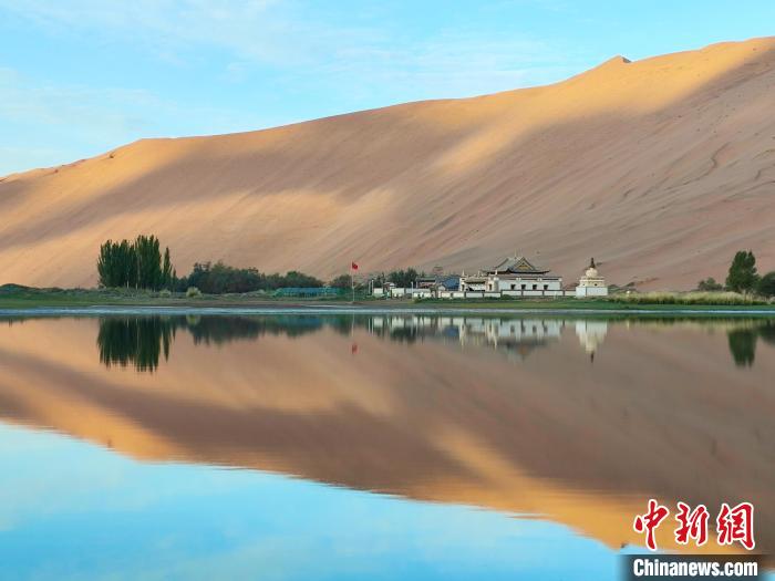 9月21日,擁有“沙漠故宮”之稱的巴丹吉林廟在湖光山色之中映出倒影。中新社記者 陳溯 攝