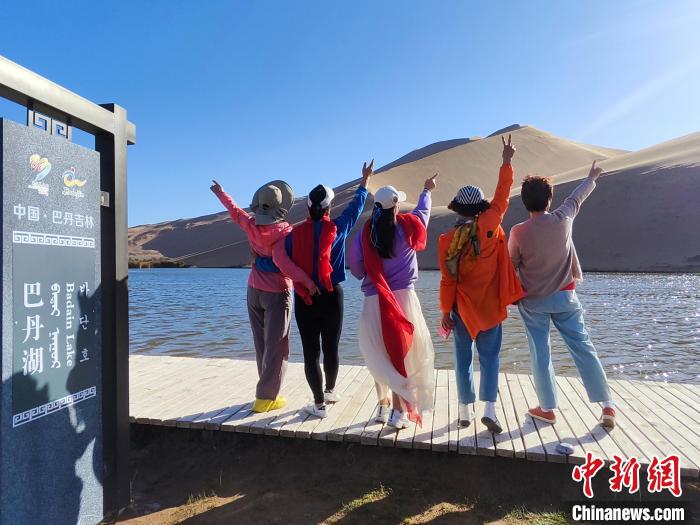 9月21日,來自天津的游客在巴丹湖邊留下合影。 中新社記者 陳溯 攝