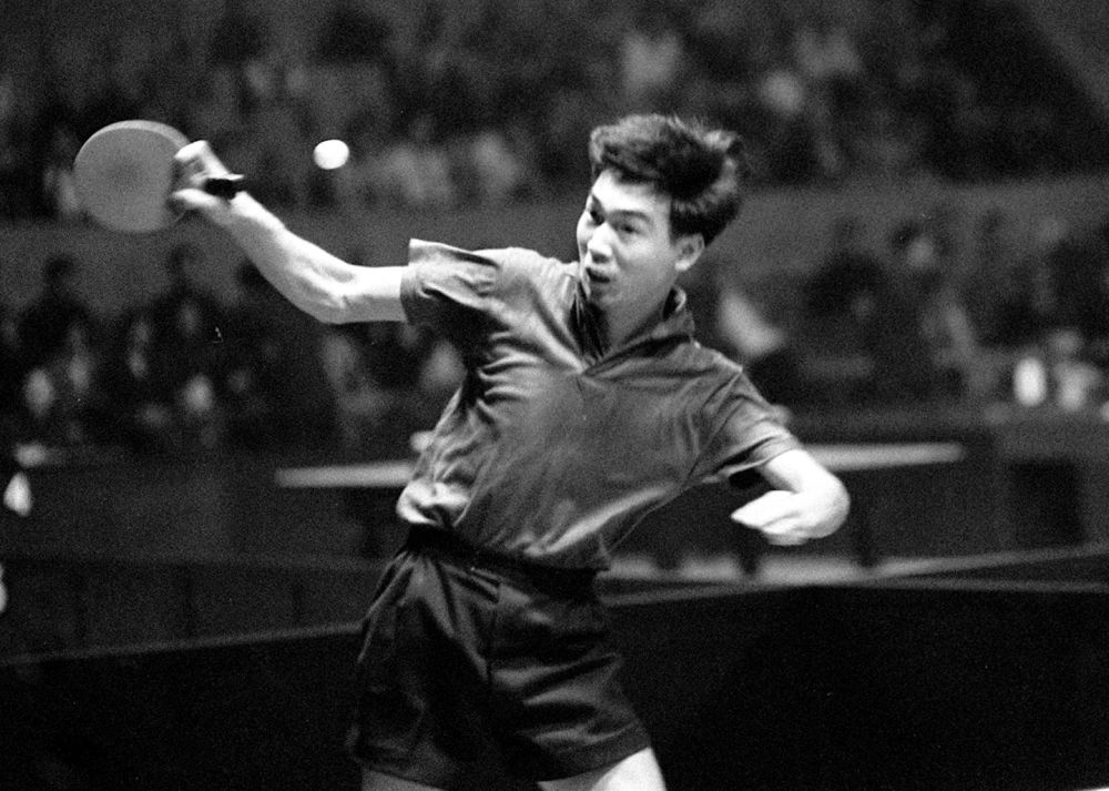 這是1961年4月11日,中國選手張燮林在第26屆世界乒乓球錦標(biāo)賽單項(xiàng)比賽中。新華社記者 鄒健東 攝