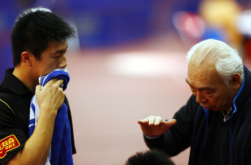 這是2007年2月9日,張燮林(右)在北京舉行的“直通薩格勒布”第49屆世乒賽單項(xiàng)賽國乒男隊(duì)選拔賽中為馬龍講解戰(zhàn)術(shù)要領(lǐng)。新華社記者 畢明明 攝