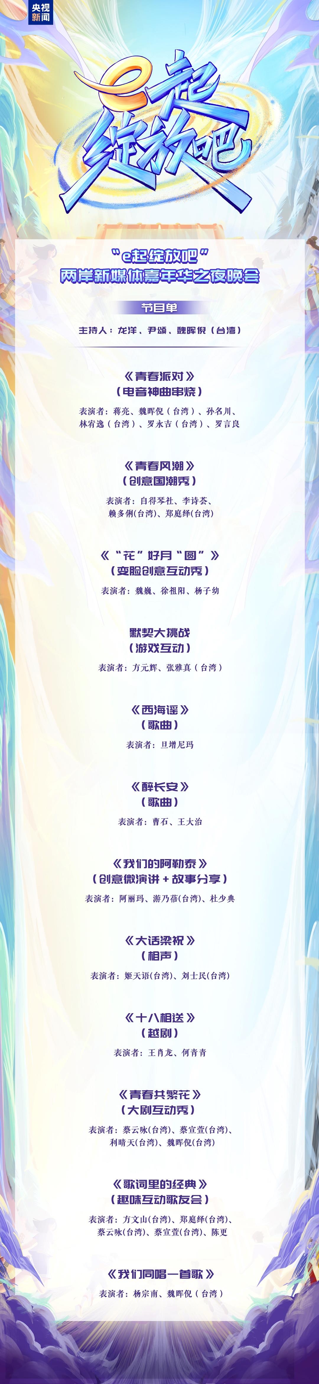 “e起綻放吧”兩岸新媒體嘉年華之夜晚會(huì)今晚(9月25日)20時(shí)將在看臺(tái)海、大灣區(qū)之聲、央視頻、央視新聞、央視財(cái)經(jīng)等平臺(tái)播出。來自兩岸的文化名人、網(wǎng)紅博主、青年代表以“才藝+故事”的融合表現(xiàn)形式,結(jié)合影視劇、國(guó)潮音樂、舞蹈、詩(shī)詞歌賦、旅游美食等文化元素,共尋文化記憶、共話青春故事、共融民族情感,共享一場(chǎng)心手相牽的青春盛宴。兩岸年輕人在晚會(huì)中同唱一首歌、同追一部劇、同創(chuàng)一首詩(shī),展現(xiàn)兩岸交流交往、融合發(fā)展中的蓬勃青春力量。