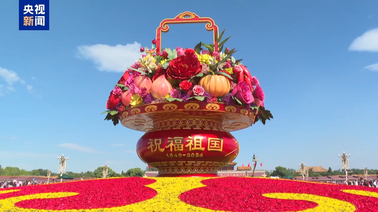 今天,北京秋高氣爽,陽光明媚。天安門廣場(chǎng)上游人如織,廣場(chǎng)中央布置一新的巨型大花籃精彩亮相,格外耀眼,吸引了眾多游客圍觀拍照。