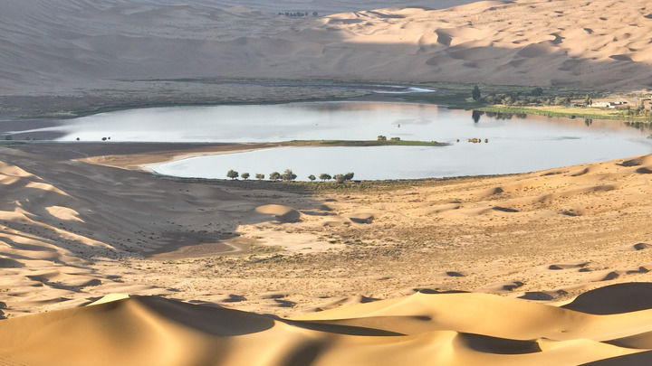 驅(qū)車深入巴丹吉林沙漠,翻過數(shù)不盡的沙丘,來到水草豐美的廟海子。這里四面環(huán)沙山,一座200多年前的白墻金頂寺廟坐落在湖邊,為雄渾壯闊的自然景象抹上一筆濃厚人文氣息。觀者無不感嘆,當(dāng)年交通不便,如何在沙漠腹地建成如此精美的建筑。