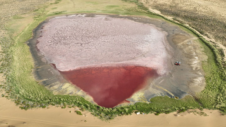 2024年7月30日拍攝的巴丹吉林沙漠中的紅海子(無人機照片)。
