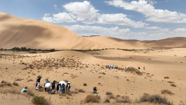 2024年7月31日,來自蘭州大學(xué)、香港浸會大學(xué)、西南大學(xué)等18所高校的100余位師生在巴丹吉林沙漠開展“發(fā)現(xiàn)計劃”地理學(xué)聯(lián)合實習(xí),這是部分師生在巴丹吉林沙漠中開展植被樣方調(diào)查(無人機照片)。