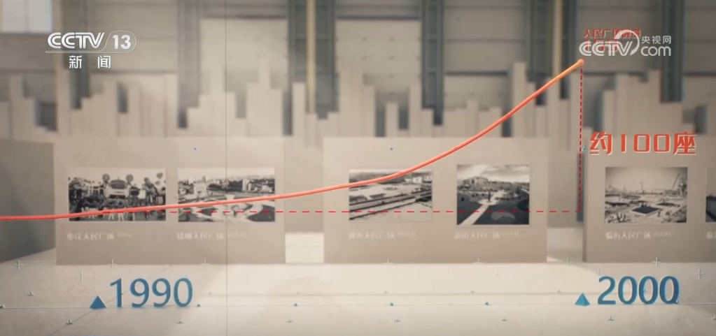 追溯歷史,將人民廣場的建設與時間線關聯(lián),我們發(fā)現(xiàn)了全國人民廣場建設的兩個重要時間節(jié)點:在90年代,隨著城鎮(zhèn)化的步伐,更多的廣場滿足了人們對公共空間的新需求,大約有100座人民廣場在這十年間建成。2013年左右,一股新的建設浪潮出現(xiàn)在小型縣城,尤其是在剛剛擺脫貧困的地區(qū)興起,人民廣場的增量又與脫貧攻堅的進程同步見證了一塊塊土地從貧瘠到繁榮的動人變遷。