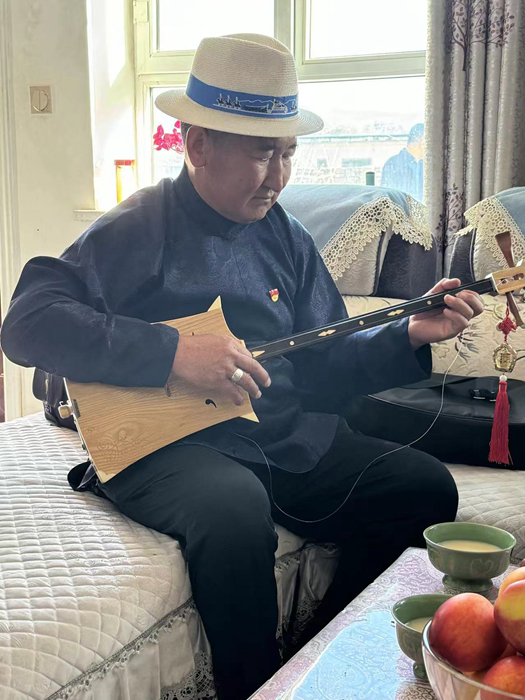 甫·巴特孟克向采訪團(tuán)展示才藝,他住的安居房在2017年精河縣6.6級(jí)地震中安然無恙。新華網(wǎng)發(fā)