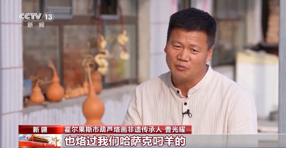 霍爾果斯市葫蘆烙畫非遺傳承人 曹光耀:特別喜歡烙我們新疆的特色,獨(dú)特之處就是說(shuō)燙畫、烙畫、火筆畫它能顯出一種自然的美,它還有古色古香的古韻,特別接地氣。作為烙畫非遺傳承人,我們必須要把好的文化傳承下去。