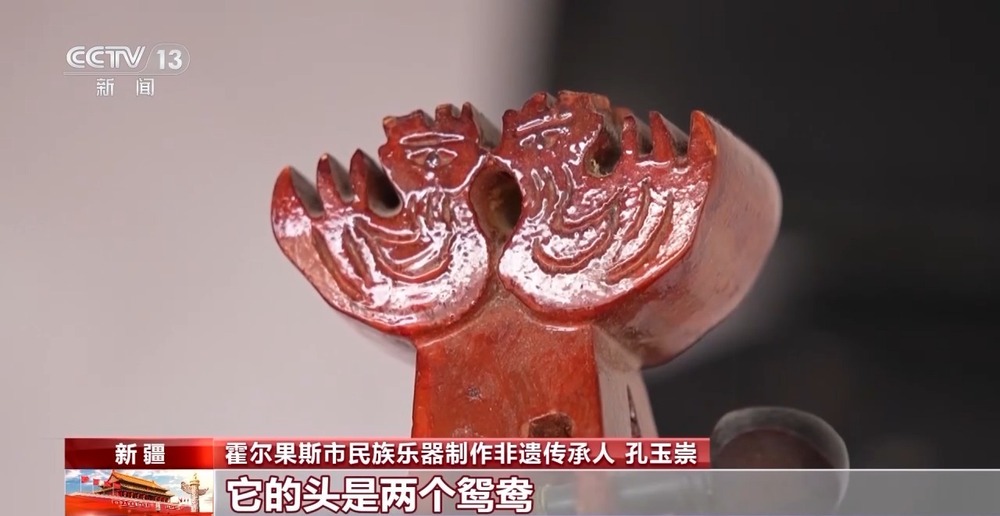 霍爾果斯市民族樂(lè)器制作非遺傳承人 孔玉崇:鴛鴦是很美好的,它有兩個(gè)腹板,也可以互為背板。它的頭是兩個(gè)鴛鴦,在一個(gè)腿上可以彈,坐著也可以拉,很方便。你帶著這么一把琴就等于帶了兩把琴,因?yàn)樗囊灿校瑥椀囊灿小?/p>