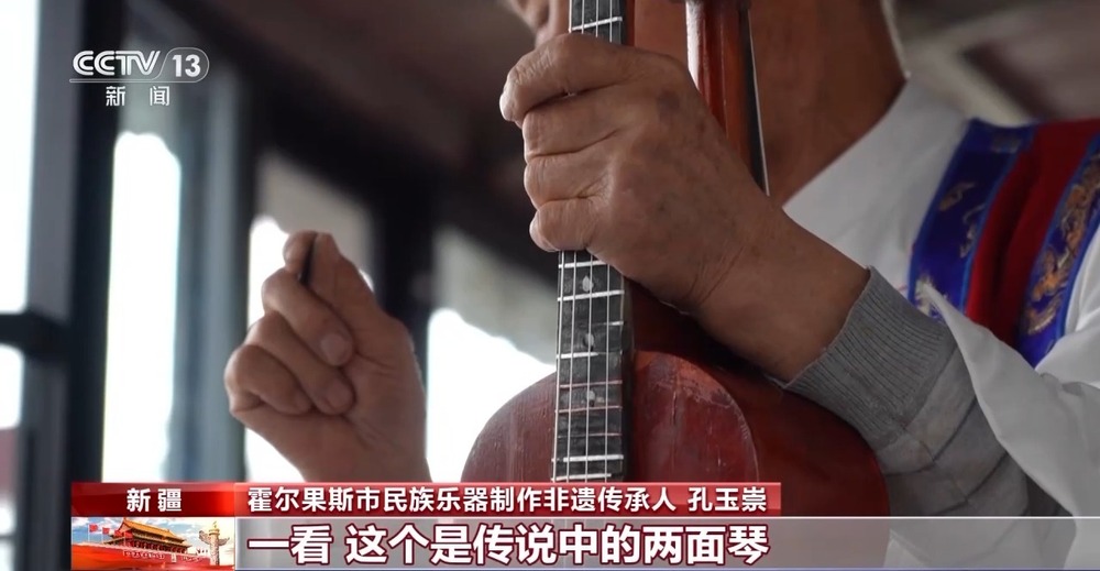 霍爾果斯市民族樂(lè)器制作非遺傳承人 孔玉崇:老人畫了一個(gè)圖,他問(wèn)我,這樣的一個(gè)琴你能不能做。我一看,這個(gè)是傳說(shuō)中的兩面琴,我說(shuō)我做,就這樣開(kāi)始了。