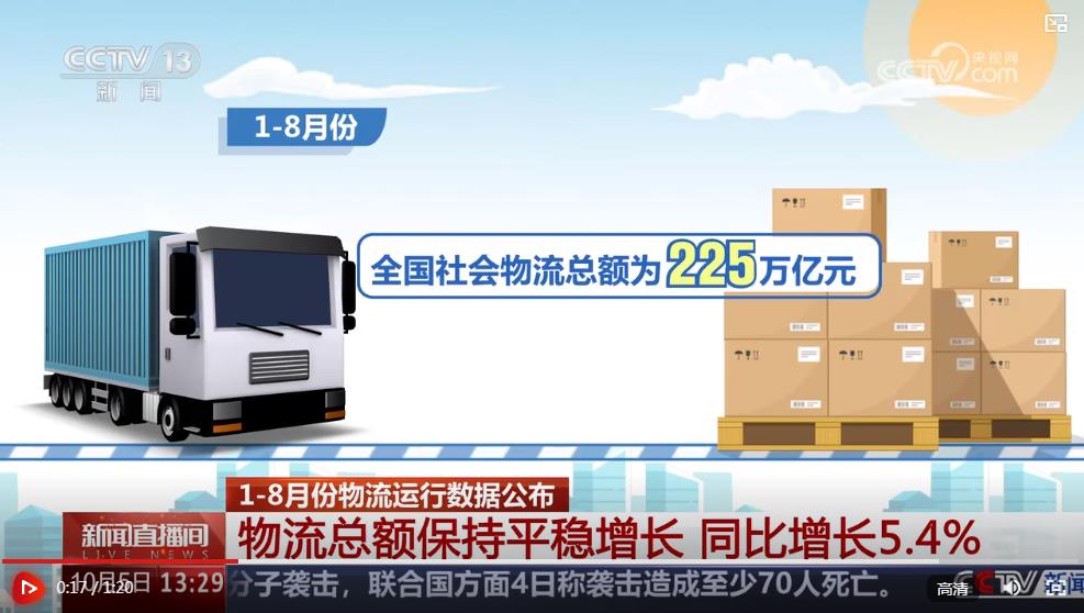 央視網(wǎng)消息:中國(guó)物流與采購聯(lián)合會(huì)10月5日公布今年1至8月份物流運(yùn)行數(shù)據(jù)。數(shù)據(jù)顯示,8月份社會(huì)物流運(yùn)行總體穩(wěn)定,社會(huì)物流總額累計(jì)保持5%以上的穩(wěn)定增長(zhǎng)。