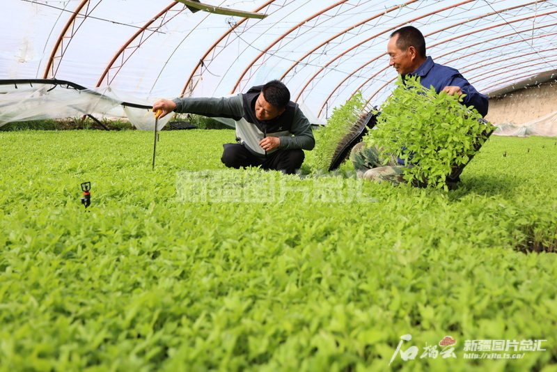 2023年4月17日,新疆生產(chǎn)建設兵團第五師86團一家種植專業(yè)合作社大棚育苗基地里,農(nóng)技人員指導社員管護蔬菜苗。呂羨林攝