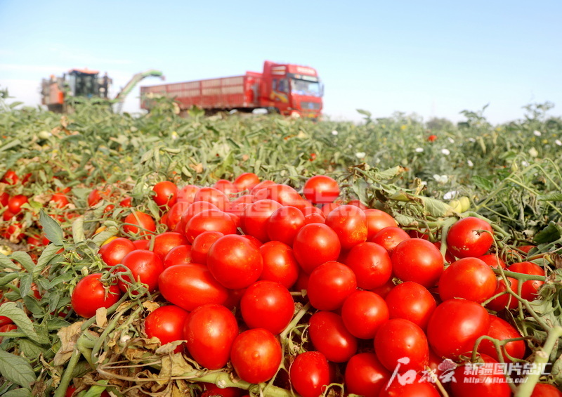 2024年8月15日,在新疆生產(chǎn)建設兵團第六師101團一塊農(nóng)田里,職工采用機械收獲加工番茄。魏新江攝