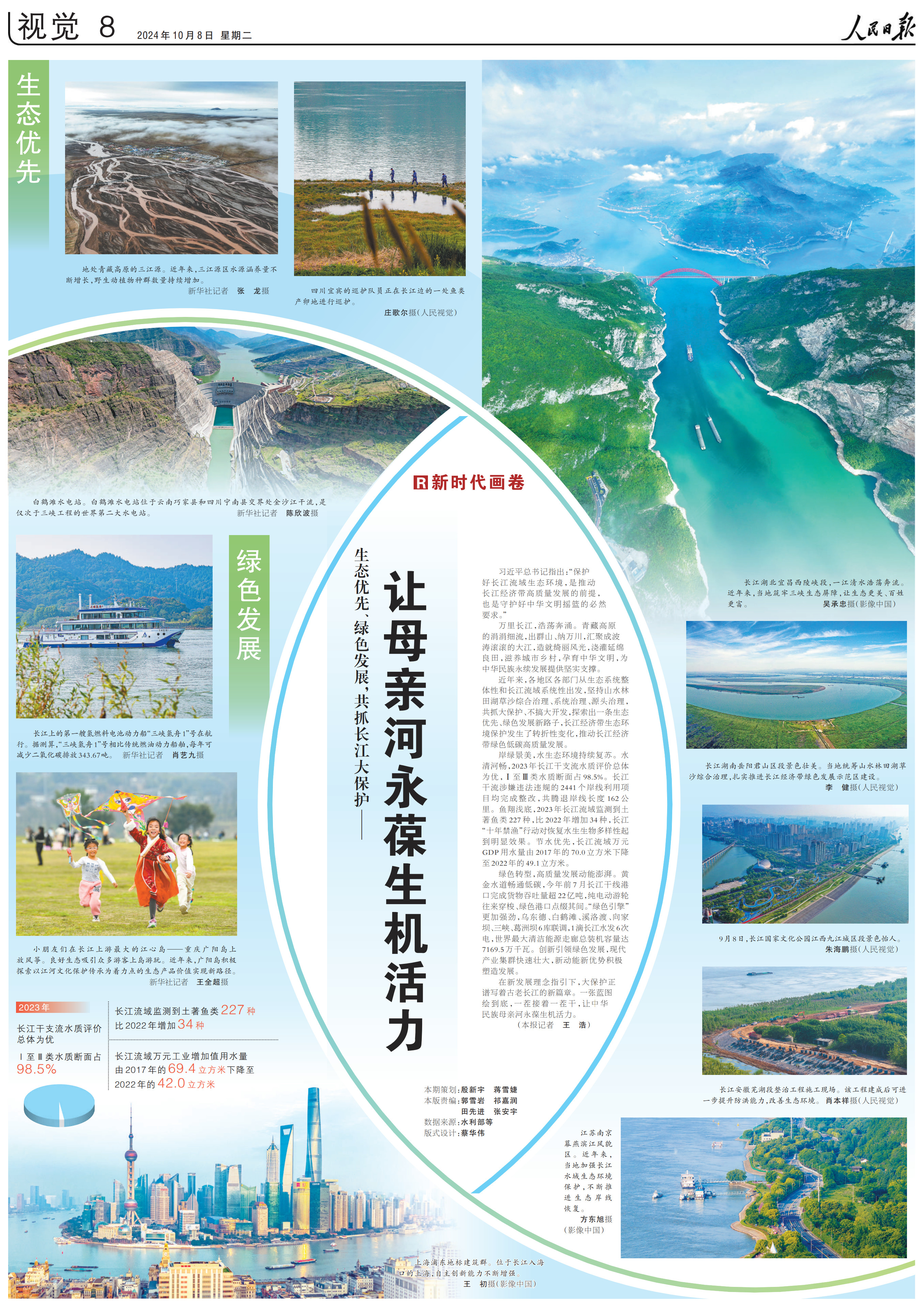 岸綠景美,水生態(tài)環(huán)境持續(xù)復(fù)蘇。水清河暢,2023年長江干支流水質(zhì)評價總體為優(yōu),Ⅰ至Ⅲ類水質(zhì)斷面占98.5%。長江干流涉嫌違法違規(guī)的2441個岸線利用項目均完成整改,共騰退岸線長度162公里。魚翔淺底,2023年長江流域監(jiān)測到土著魚類227種,比2022年增加34種,長江“十年禁漁”行動對恢復(fù)水生生物多樣性起到明顯效果。節(jié)水優(yōu)先,長江流域萬元GDP用水量由2017年的70.0立方米下降至2022年的49.1立方米。