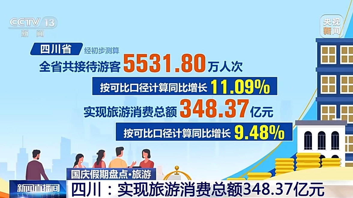 四川省經(jīng)初步測(cè)算,全省共接待游客5531.80萬人次,實(shí)現(xiàn)旅游消費(fèi)總額348.37億元,按可比口徑計(jì)算,同比分別增長(zhǎng)11.09%和9.48%。全省核心旅游景區(qū)“狀態(tài)拉滿”,17家5A級(jí)景區(qū)累計(jì)接待游客426.93萬人次、實(shí)現(xiàn)門票收入1.85億元,同比分別增長(zhǎng)25.06%和15.48%,超越假日歷史最高水平。九寨溝景區(qū)連續(xù)4天均達(dá)4.1萬人承載量上限。