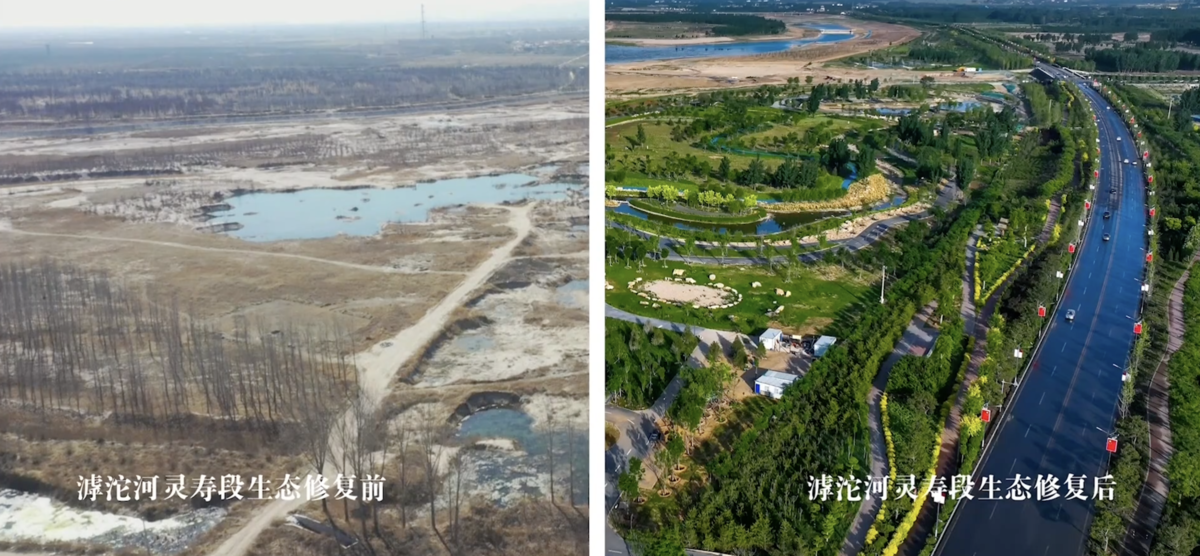 滹沱河靈壽段生態(tài)修復前后對比圖。(石家莊市水利局 供圖 )
