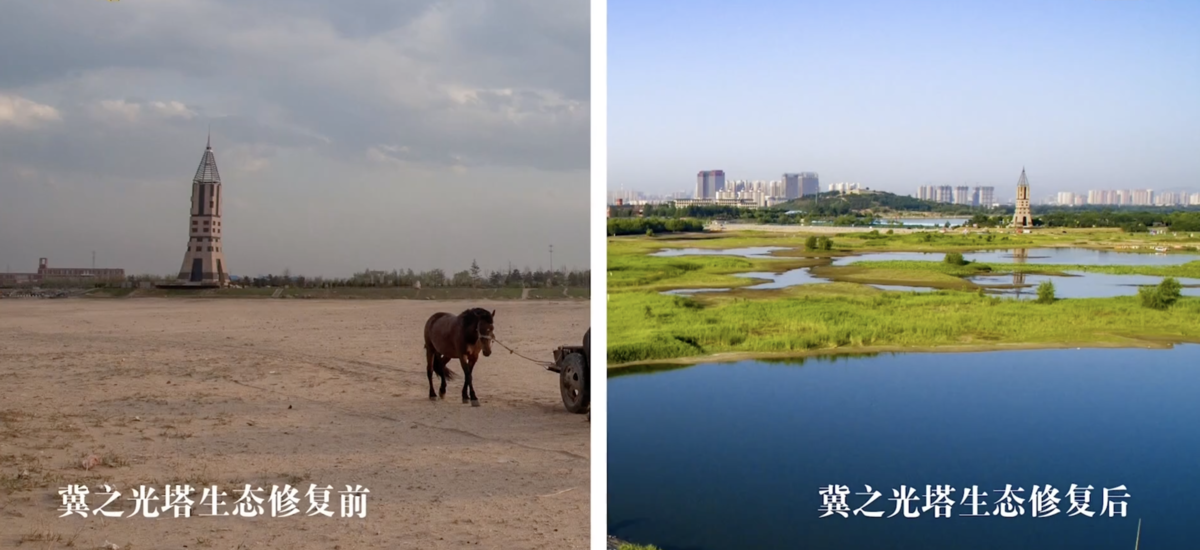 滹沱河塔之光生態(tài)修復前后對比圖。(石家莊市水利局 供圖 )
