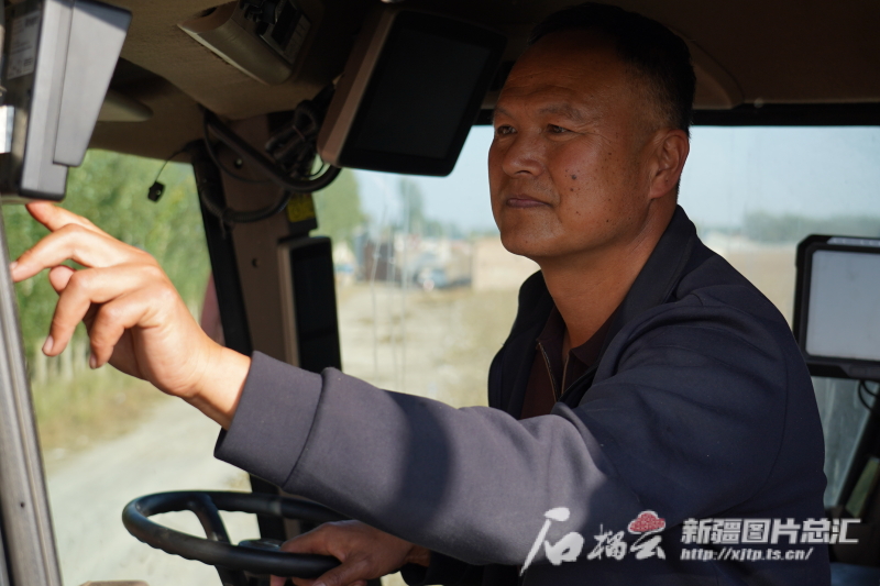 10月10日,何洪濤在采棉機駕駛室內(nèi)調(diào)設(shè)備。孫志坤 攝