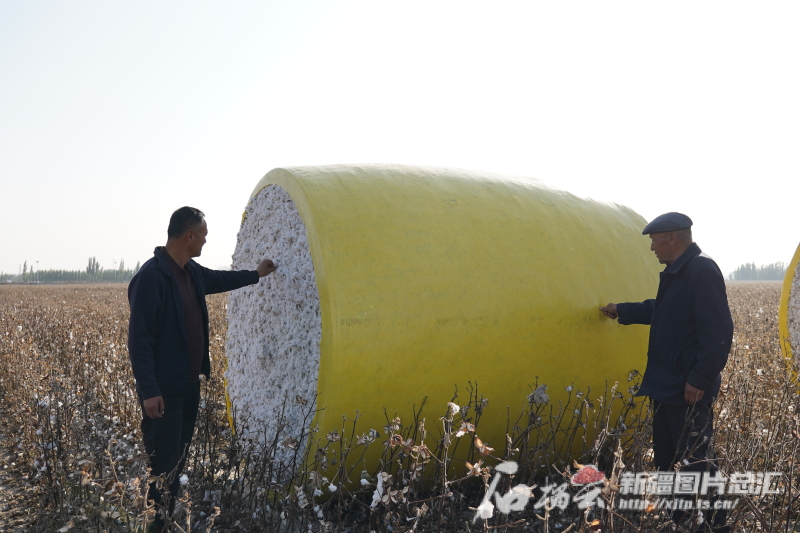 10月10日,何洪濤和棉農(nóng)正在查看打包好的“金蛋蛋”。孫志坤 攝