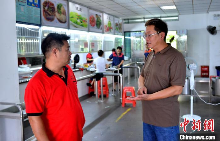臺胞莊書賢(右)與企業(yè)食堂員工交流。中新社記者 呂明 攝