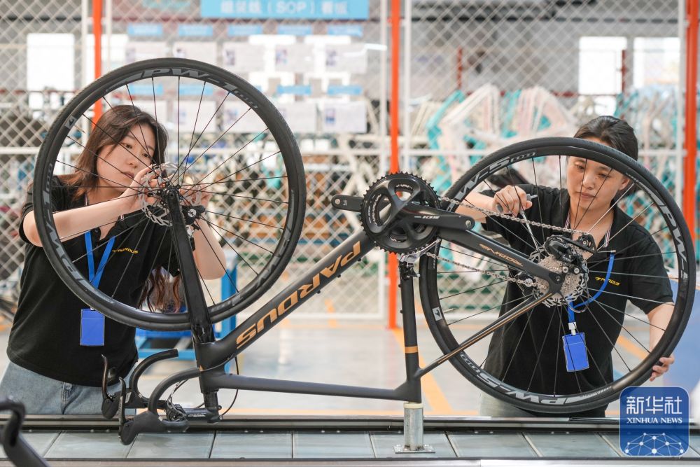 2024年7月8日,在山東泰山瑞豹復(fù)合材料有限公司生產(chǎn)車間,工人在組裝碳纖維自行車。位于山東樂陵經(jīng)濟(jì)開發(fā)區(qū)的泰山體育產(chǎn)業(yè)集團(tuán)為2024巴黎奧運(yùn)會(huì)的摔跤、自行車、跆拳道、體操、田徑等比賽提供器材。新華社記者 朱崢攝