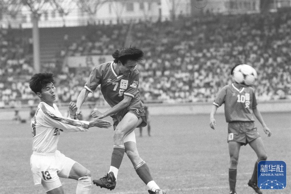 1994是中國(guó)足球職業(yè)化改革元年。這是1994年4月17日,全國(guó)足球甲級(jí)聯(lián)賽全面拉開戰(zhàn)幕。廣東宏遠(yuǎn)俱樂部隊(duì)主場(chǎng)0比2負(fù)于北京國(guó)安俱樂部隊(duì),這是國(guó)安隊(duì)7號(hào)謝峰(中)在頭球攻門。 新華社記者 劉彥武攝