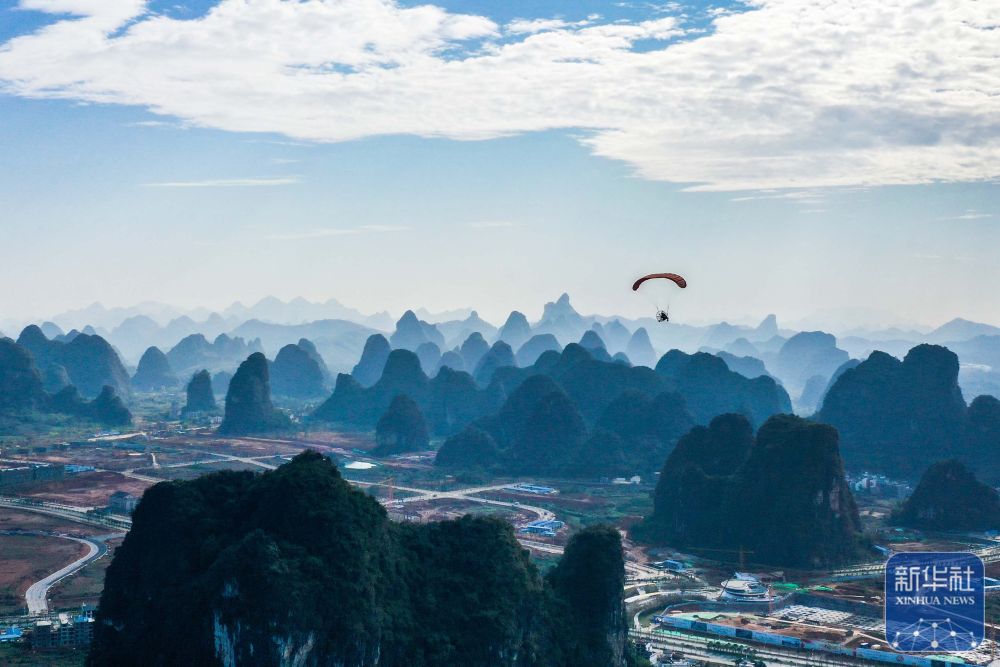 游客在廣西桂林市陽(yáng)朔縣體驗(yàn)動(dòng)力滑翔傘(2019年11月14日攝,無人機(jī)照片)。 新華社記者 曹祎銘 攝