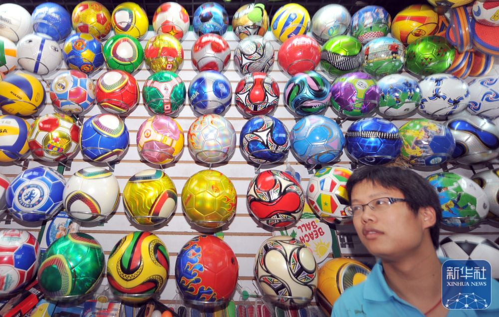 2010年6月23日,一位顧客正在浙江義烏小商品市場(chǎng)內(nèi)選購(gòu)足球。據(jù)義烏海關(guān)統(tǒng)計(jì),受南非世界杯帶動(dòng),當(dāng)?shù)伢w育用品的月度出口額連續(xù)半年超過1000萬美元,2010年前5個(gè)月的出口額比前一年同期增長(zhǎng)110%。 新華社記者 王定昶 攝