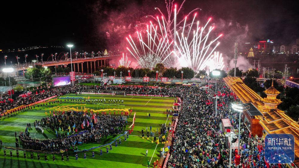 2024年2月3日,音樂煙花秀在“村晚”上演(無人機(jī)照片)。當(dāng)日,2024全國(guó)“村晚”示范展示活動(dòng)暨貴州“村超村晚”在貴州省黔東南苗族侗族自治州榕江縣拉開帷幕。活動(dòng)包括“村超村晚”文藝展示、2024龍年“村超”賀歲戰(zhàn)等內(nèi)容。新華社記者 劉續(xù) 攝