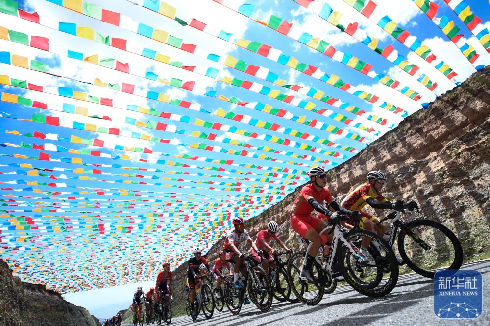 2022年7月29日,參賽選手在比賽中騎行。 當(dāng)日,第二十一屆環(huán)青海湖國(guó)際公路自行車賽進(jìn)行了第三賽段貴德至共和的角逐。 新華社記者 張龍 攝