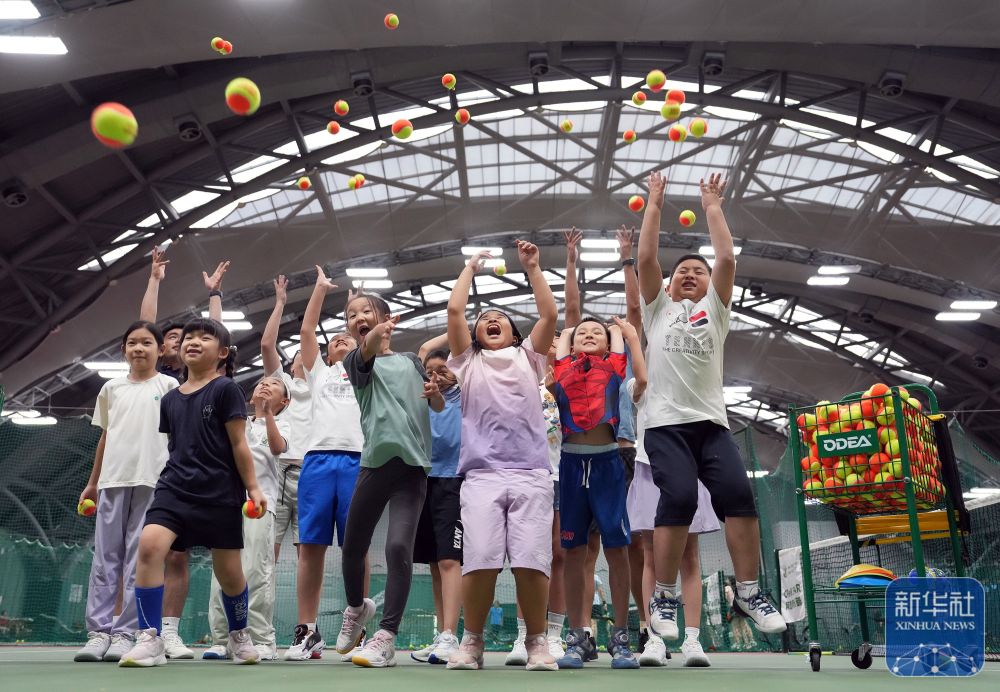 2024年8月14日,在北京一家網(wǎng)球俱樂部,小學(xué)員在結(jié)束網(wǎng)球暑期夏令營(yíng)的課程后合影。 新華社記者 才揚(yáng) 攝