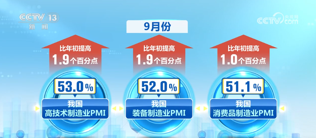 9月份,我國高技術制造業(yè)、裝備制造業(yè)和消費品制造業(yè)PMI分別為53.0%、52.0%、51.1%,比年初提高了1.9個、1.9個、1.0個百分點。相關行業(yè)處于擴張區(qū)間,景氣水平連續(xù)上升。
