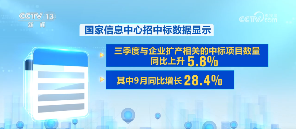 不僅工程建設在提速,作為項目落地的第一步,中標數(shù)據(jù)也在快速增長。國家信息中心招中標數(shù)據(jù)顯示,三季度與企業(yè)擴產(chǎn)相關的中標項目數(shù)量同比上升5.8%,其中9月同比增長28.4%,為今年以來最高增速,企業(yè)擴產(chǎn)熱度回升明顯。