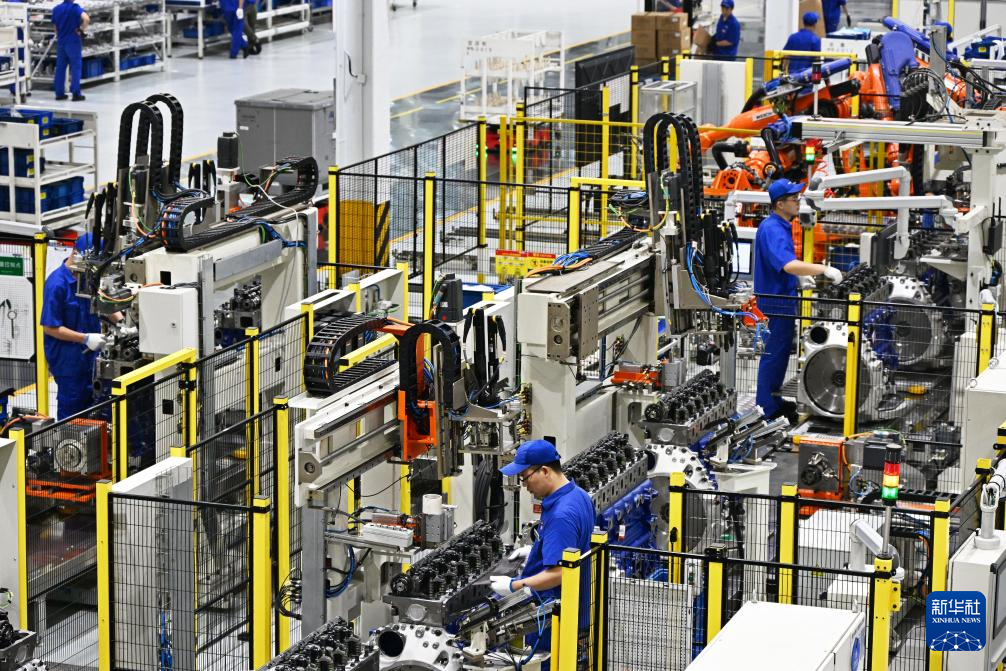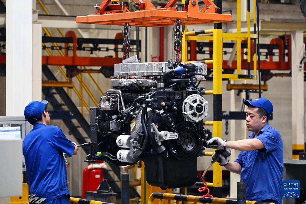 在濰柴集團(tuán)車間內(nèi),工人在裝配發(fā)動機(jī)(8月21日攝)。新華社記者 李紫恒 攝