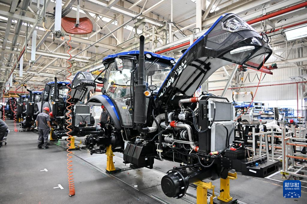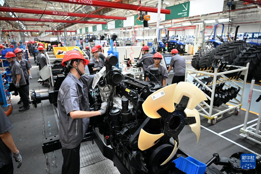 在濰柴雷沃智慧農(nóng)業(yè)科技股份有限公司拖拉機(jī)工廠,工人在裝配智能拖拉機(jī)(8月21日攝)。新華社記者 李紫恒 攝
