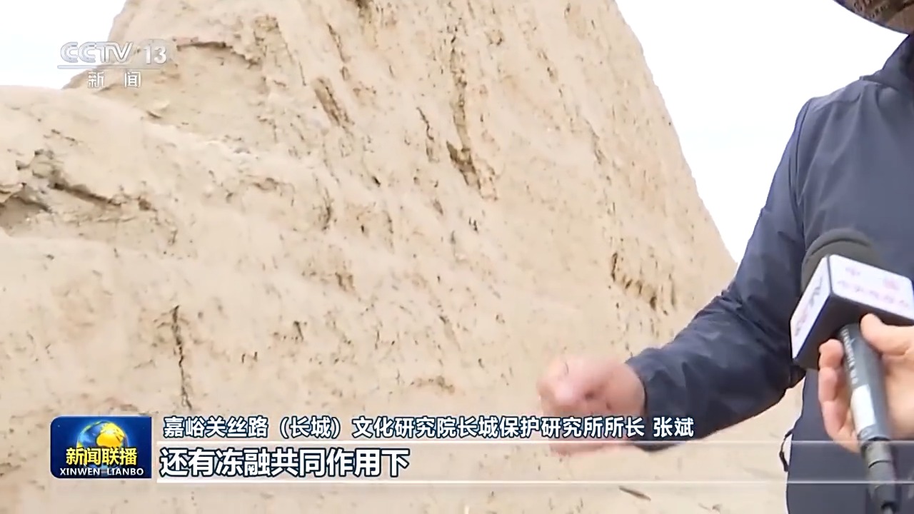 嘉峪關(guān)絲路(長(zhǎng)城)文化研究院長(zhǎng)城保護(hù)研究所所長(zhǎng) 張斌:這塊就是風(fēng)雪,還有凍融共同作用下,形成一個(gè)很深的掏蝕凹槽,可能掏蝕進(jìn)去20多公分,所以我們通過(guò)對(duì)它進(jìn)行日常維護(hù),就是對(duì)它進(jìn)行夯補(bǔ),它這個(gè)墻體的穩(wěn)定性就好了。