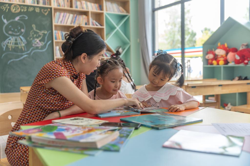 2024年9月25日,在重慶市江津區(qū)珞璜鎮(zhèn)碑亭社區(qū),社區(qū)居民郭明會(左一)帶著小孩閱讀用社??ń栝喌膱D書。新華社記者 黃偉 攝