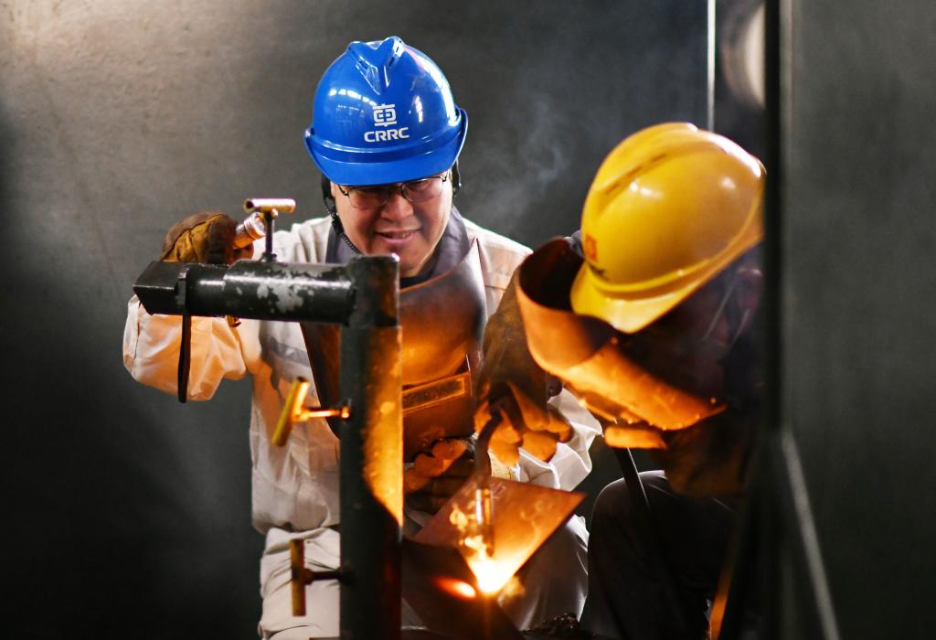 2024年2月4日,中車齊齊哈爾車輛有限公司貨車分廠電焊高級(jí)技師、高級(jí)工程師王海(左)指導(dǎo)徒弟焊接試件。新華社記者 王建威 攝