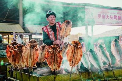 尉犁縣羅布人村寨的烤魚美食。宋唯一攝