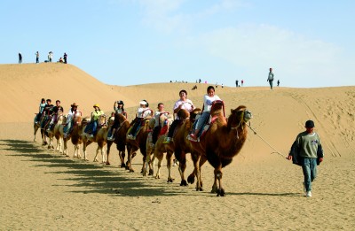 游客在尉犁縣羅布人村寨東沙山騎駱駝。汪志鵬攝