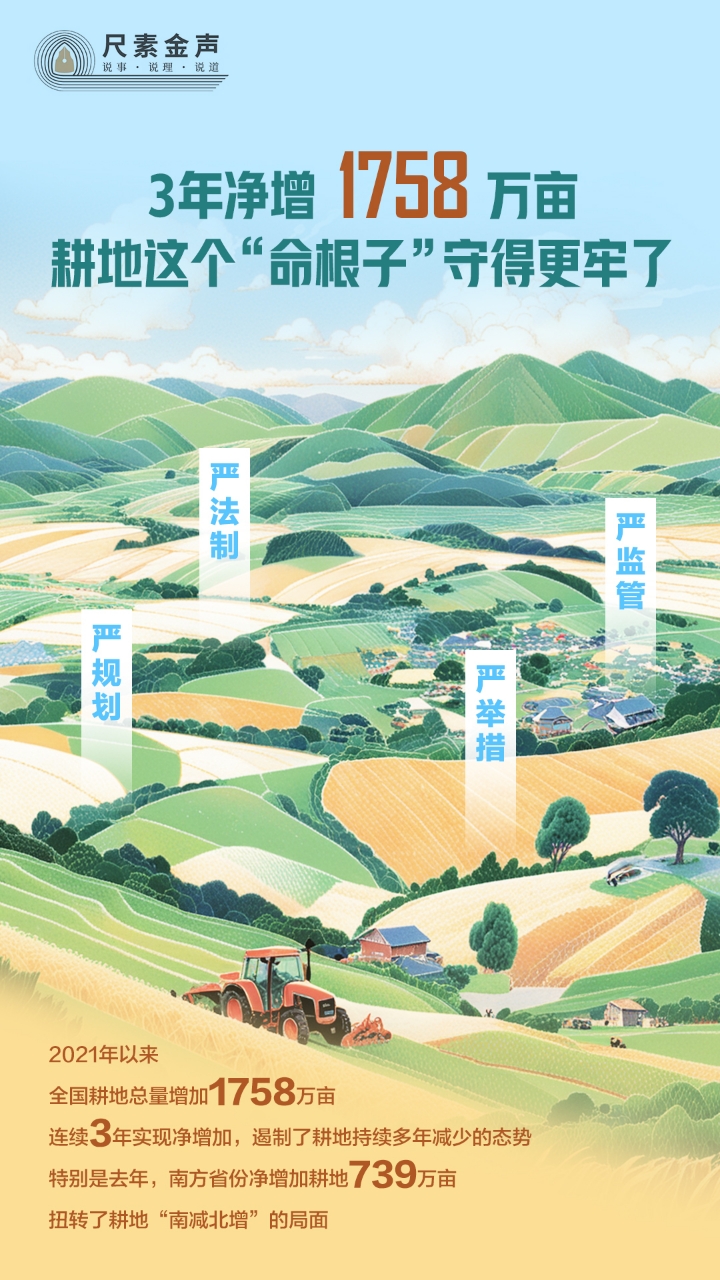 今天的耕地就是明天的飯碗。統(tǒng)籌發(fā)展與安全,堅(jiān)持穩(wěn)數(shù)量、提質(zhì)量、優(yōu)生態(tài)“三位一體”,進(jìn)一步改革完善耕地占補(bǔ)平衡制度,讓18億畝耕地實(shí)至名歸,讓每寸耕地都成為豐收沃土,讓大國糧倉根基更加穩(wěn)固。