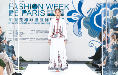 模特在法國巴黎舉行的中國楚雄非遺服飾時裝展上展示時裝。