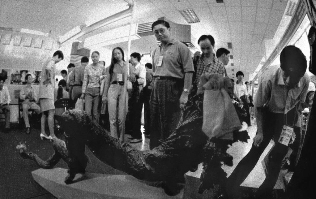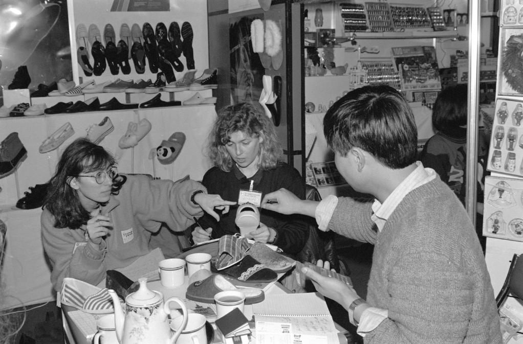 1991年3月,在上海舉行的首屆華東出口商品交易會(后發(fā)展為華東進出口商品交易會,簡稱“華交會”)上,兩名意大利客商同浙江省輕工業(yè)品進出口公司代表洽談業(yè)務(wù)。新華社記者 柳中央 攝