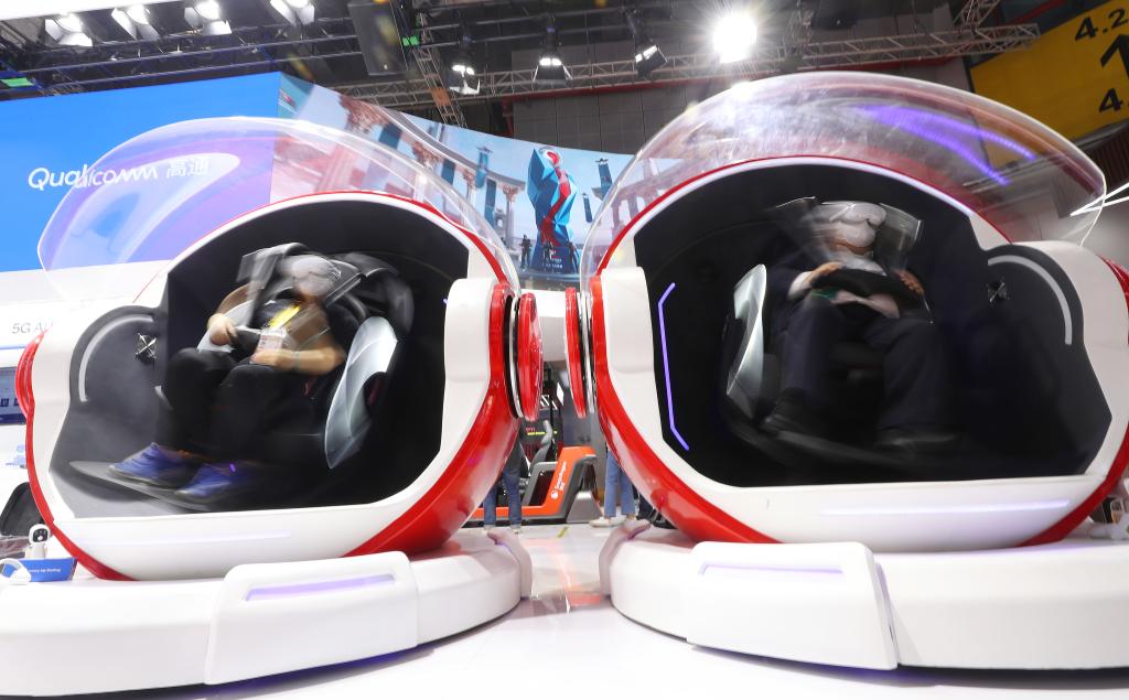 2022年11月5日,參觀者在第五屆進博會技術(shù)裝備展區(qū)體驗一款VR游戲座椅。新華社記者 方喆 攝