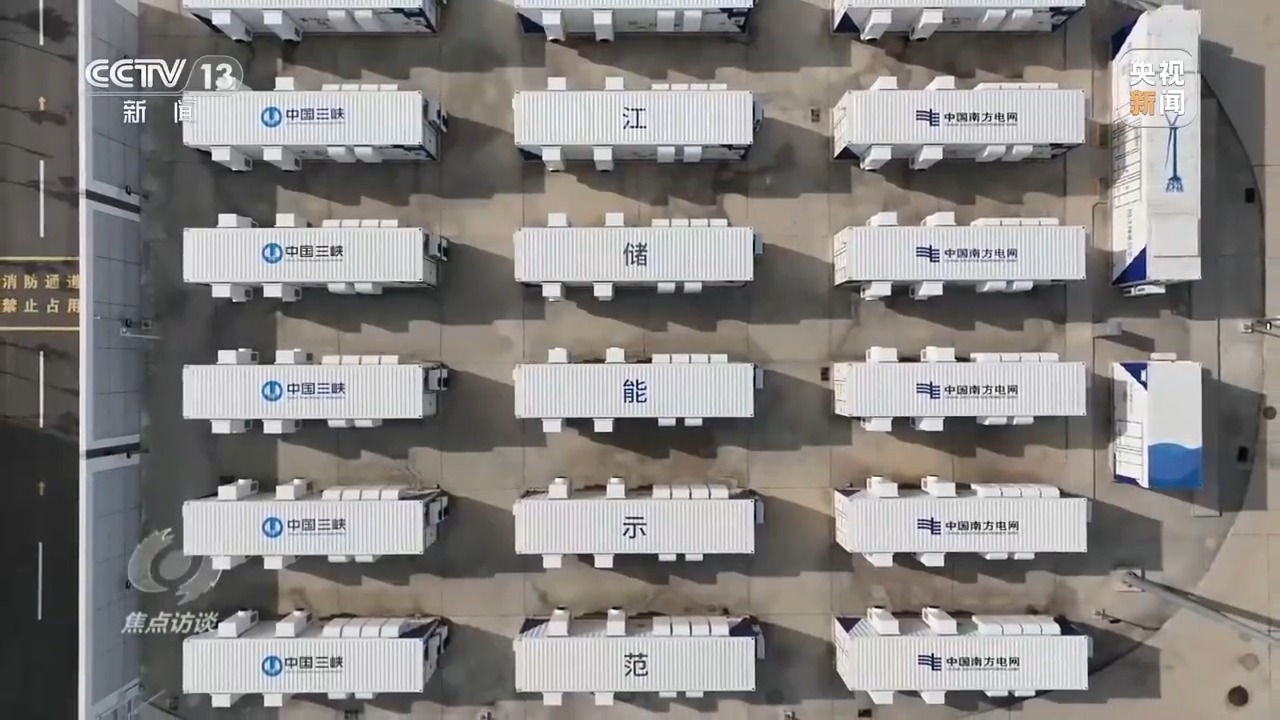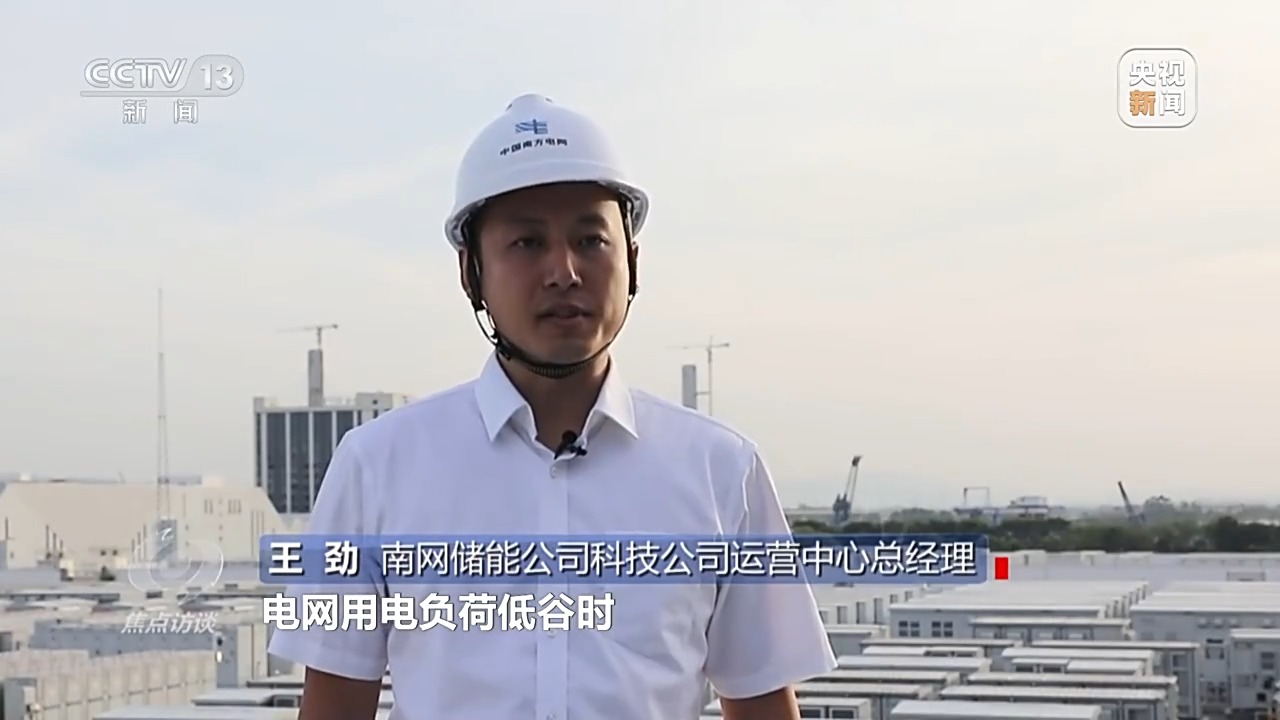 南網儲能公司科技公司運營中心總經理 王勁:電網用電負荷低谷時,把電廠發(fā)出的多余的電儲存到250個電池儲能柜內,用電高峰時,把電池儲能柜里的電能釋放出來支持電網的電力供應。