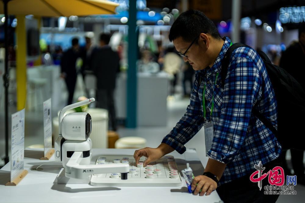 觀眾在智能裝備展示區(qū)圍觀新型外骨骼機(jī)器人。中國網(wǎng)記者