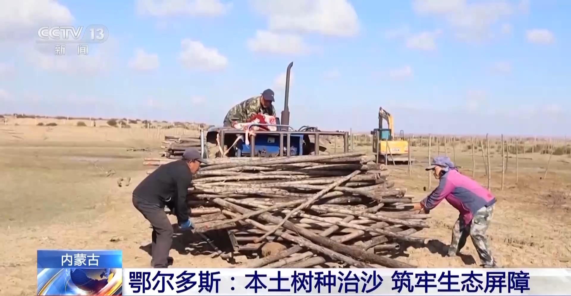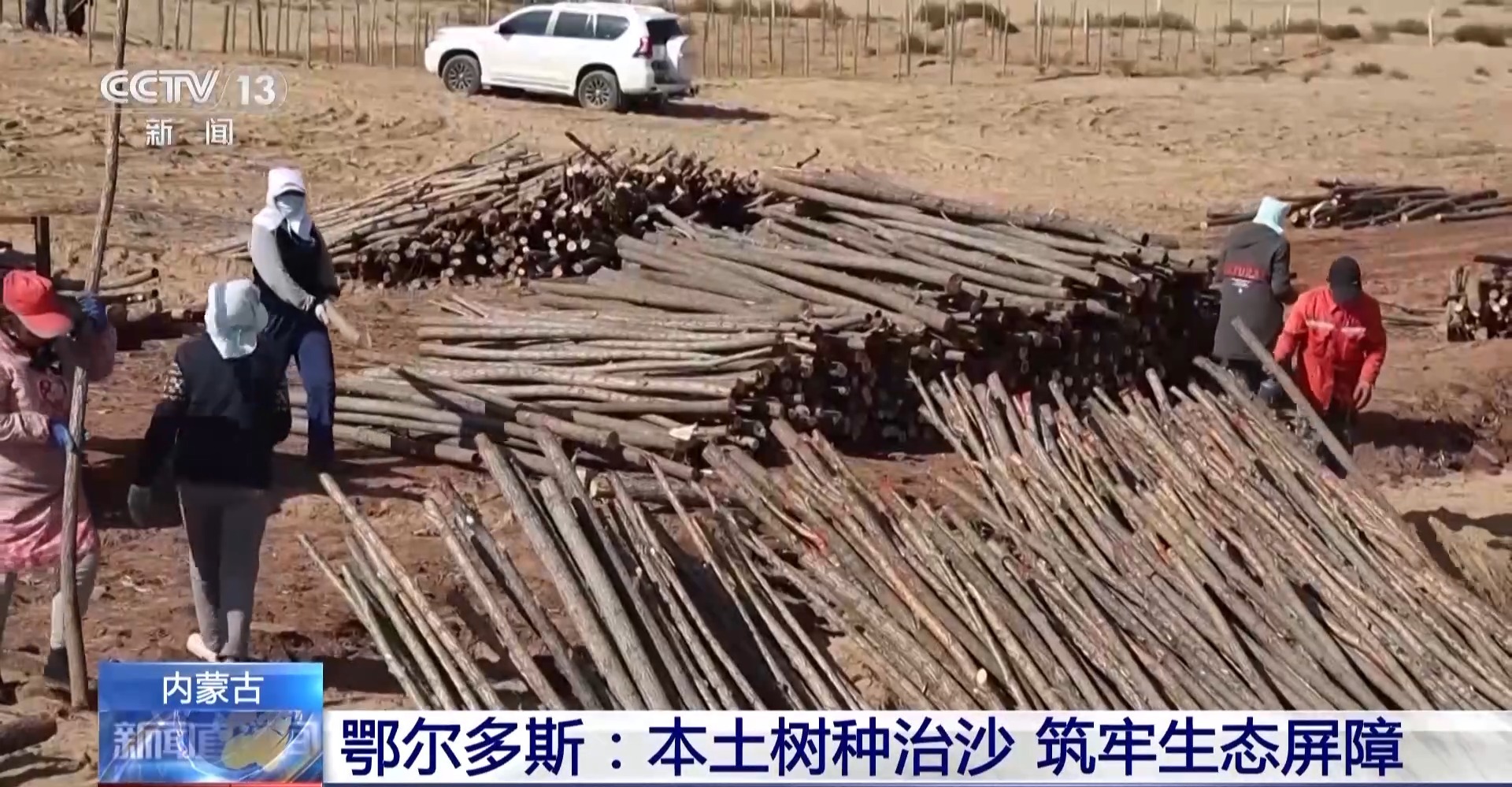 烏審旗某植樹造林項(xiàng)目經(jīng)理 何瑞東:旱柳苗木是從烏審旗周邊農(nóng)牧民自己家的柳樹進(jìn)回來的,有效地提高當(dāng)?shù)啬撩竦囊徊糠质杖?。我們?yán)格收料,控制苗木的高度、胸徑,以及苗木質(zhì)量。苗木運(yùn)來后要充分泡苗,充分地讓旱柳把水分吸收,開始要根部蘸漿,蘸一種肥料,促進(jìn)根部發(fā)育,然后用到施工現(xiàn)場(chǎng)。