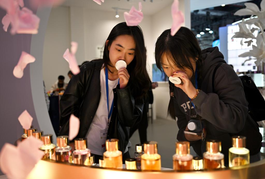 11月9日,觀眾在第七屆進博會歐萊雅展臺試聞香水。歐萊雅是進博會七屆“全勤生”。新華社發(fā)(陳浩明 攝)